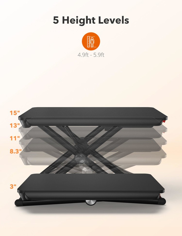 - 원하는 대로 앉거나 서십시오. 잠금 레버를 들어 올려 3-15"의 고도 범위에서 5단계를 선택하여 4.9-5.9'의 스탠딩 데스크 높이를 만드십시오.